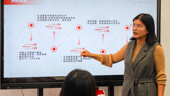 随后,工作室主持人、石油工程学院辅导员王静对工作室近期开展的文创产品设计、场地空间设计等工作进展情况进行了说明。目前,工作室已设计制作7类、10余种特色鲜明的文创产品,助力工作室品牌形象塑造和影响力提升。工作室成员、石油工程学院辅导员杨琪硕还介绍了原创大师剧、音诗画以及剧团演员招募等工作的进度。