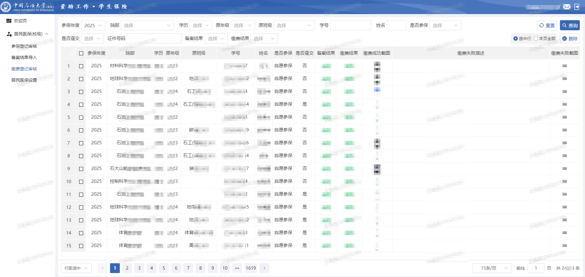 2025年是国家基本医保参保长效机制实施的第一年,青岛市居民医保政策进行了较大调整:个人缴费金额和财政补助金额提高、设置断保惩罚措施、设置连续参保/零报销奖励政策、新增大学生趸缴功能等。为确保学生知晓政策、了解政策,避免断缴影响待遇享受,学校未雨绸缪,于9月召开青岛市居民医保参保工作会,并加强过程管理,于11月召开青岛市居民医保参保缴费推进会,对缴费方式、缴费金额、待遇享受等政策调整做专场解读和工作布置、推进,同时主动推进医保工作信息化建设,自主开发迭代升级学校保险系统,逐人确认、逐级审核,顺利完成全校29800人青岛市居民医保参保情况统计。