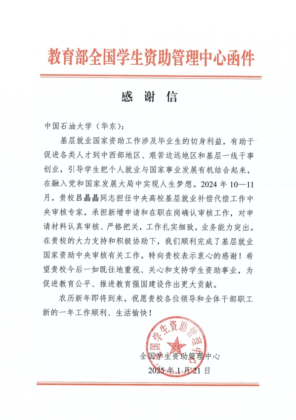 奋楫扬帆正当时,喜报传来振人心。值此新春佳节来临之际,学校相继收到教育部全国学生资助管理中心的表扬信和感谢信,对我校2023-2024学年度本科生国家奖学金评审工作给予高度肯定,向担任中央高校基层就业补偿代偿工作中央审核专家的我校吕晶晶老师表示感谢!