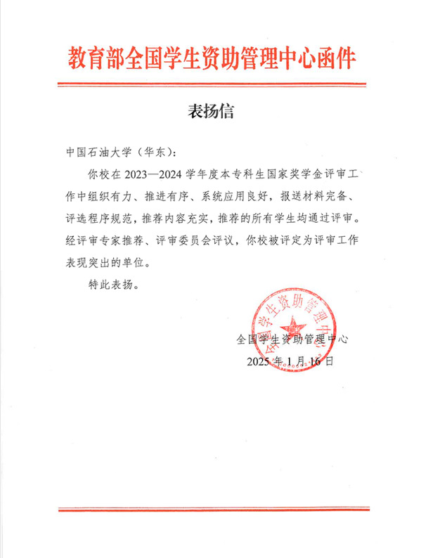 表扬信中指出:我校在2023-2024学年度本专科生国家奖学金评审工作中组织有力、推进有序、系统应用良好,报送材料完备、评选程序规范,推荐内容充实,推荐的所有学生均通过评审。经评审专家推荐、评审委员会评议,我校被评为评审工作表现突出单位。感谢信中提到:我校吕晶晶老师在担任中央高校基层就业补偿代偿工作中央审核专家期间,对申请材料认真审核、严格把关,工作扎实细致,业务能力突出,顺利协助全国学生资助管理中心完成了基层就业国家资助中央审核有关工作,特向我校表示感谢!