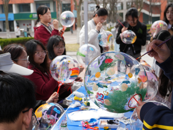 “妙手生花——春景彩绘挑战”摊位前同样热闹非凡,值班人员用打气筒为透明波波球充气并分发给参与者,同学们用水洗颜料精心描绘心中的春日美景。不一会儿,盛开的樱花、翱翔的纸鸢跃然“球”上,整个创作过程充满了欢声笑语,大家沉浸在春日的浪漫氛围中。