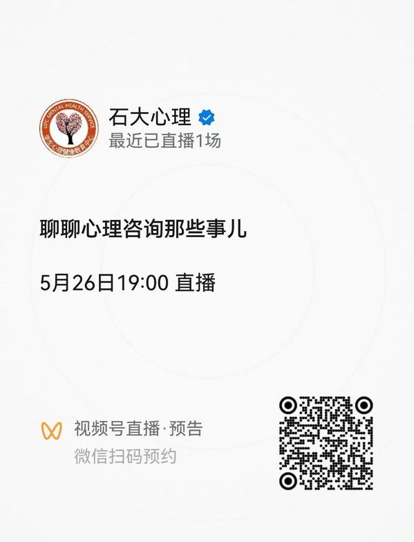 扫描下方海报二维码,关注“石大心理”微信视频号并预约直播。