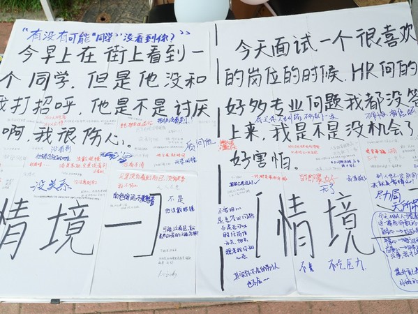参与者首先会在起点处领取引导手册,手册中设有不同的板块,分别对应人生中不同的成长阶段,在相关体验区工作人员的指引下,在手册对应的模块写上自己的感想,无论是过去式,还是进行时,又或是未来式,同学们的文字无一不美好,无一不可爱。“希望大家可以把它从心里带到笔尖,再流向我们不得而知的未来,送给那个闪闪发光的自己。”手册设计者——校心站宣传部张博雅如是说。