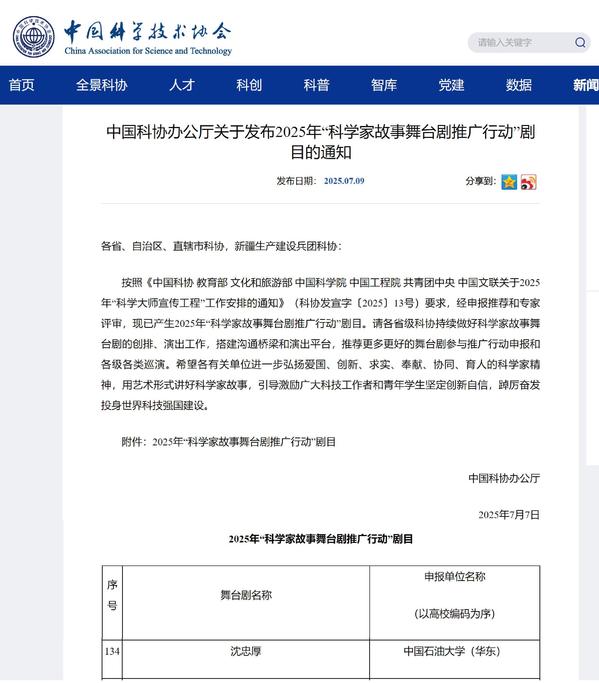 石油魂辅导员工作室原创话剧《沈忠厚》入选中国科协“科学家故事舞台剧推广行动”
