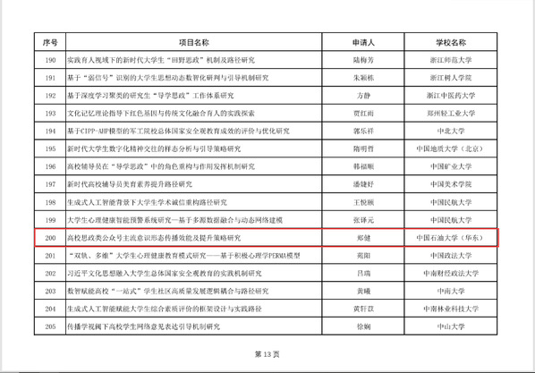 近日,教育部社会科学司公示了2025年度教育部人文社会科学研究专项任务项目(高校辅导员研究)的评审结果,储运与建筑工程学院辅导员郑健主持的《高校思政类公众号主流意识形态传播效能及提升策略研究》获评立项。本次立项是学校辅导员连续第三年获评该类项目立项。
