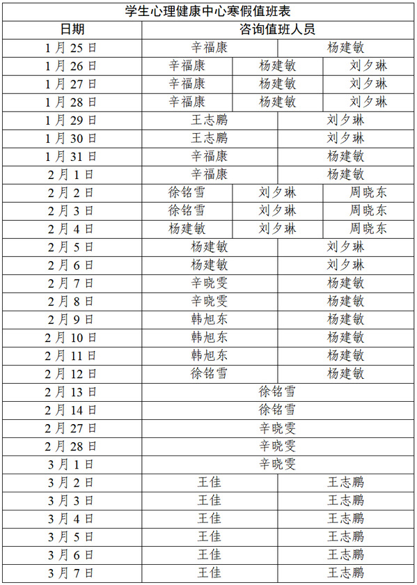 根据学校安排,我校寒假时间为1月25日至3月7日。为更好地满足同学们对心理咨询服务的需求,助力大家度过一个健康美好的寒假生活,学生心理健康教育中心面向全体学生开放线上和线下心理咨询服务。